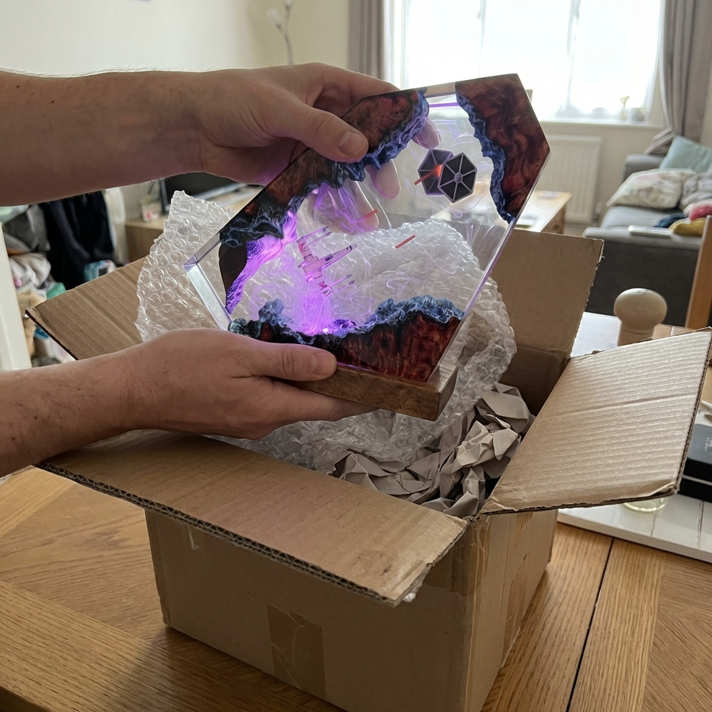 Your order includes the handmade lamp, the wooden base, and the integrated lighting setup, so it’s ready to display right away. Everything arrives carefully packed to help protect the piece during shipping.